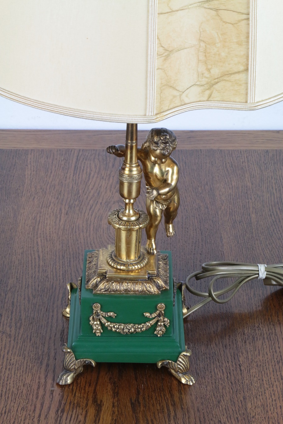 Original Empire period gilt bronze lamp. Resting on a marine green marble surmounted by gilded bronze. Functional electric.