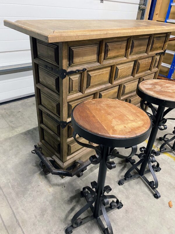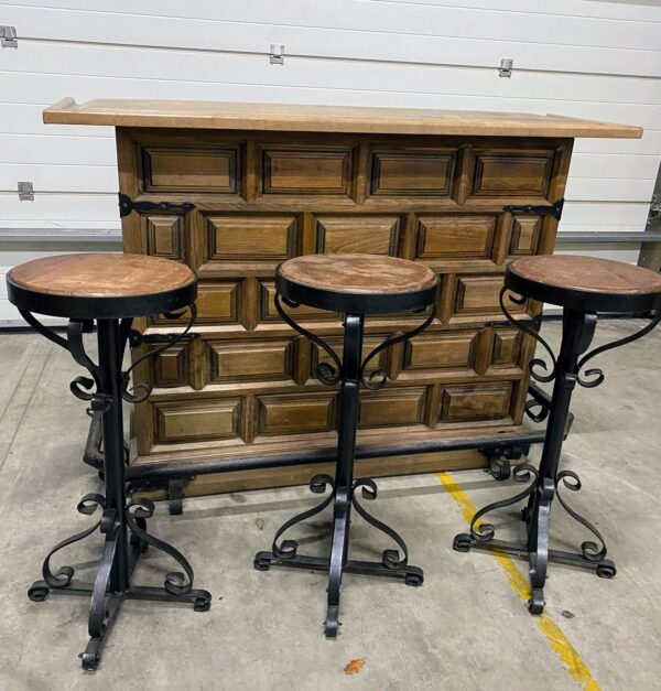 Retro industrial style bar with 3 stools made of solid hardwood and cast iron.